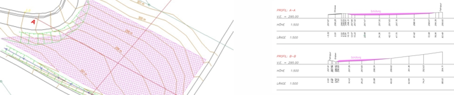 Wir erstellen einen Bestandsplan auf Basis einer terrestrischen Lage- und Höhenvermessung oder auch einer Drohnenbefliegung und stellen die Geländeveränderung planmäßig dar (Lageplan und Schnitte). Die Kubaturen der Veränderungen berechnen wir auf Basis von Geländemodellen und bereiten die erforderlichen Unterlagen für die Baubewilligung vor. Vor Bauinangriffnahme stecken wir die Baumaßnahmen ab.